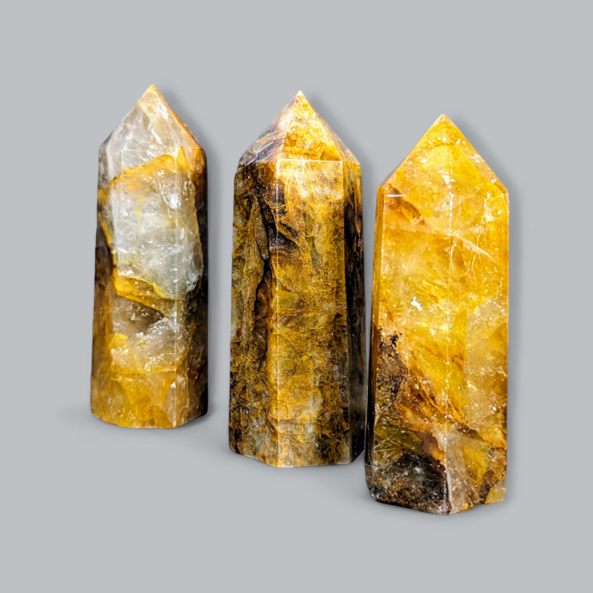 - Premium Golden Healer Quartz: Sourced from the best quality deposits, our golden healer quartz towers exhibit a stunning range of warm golden tones, enriched with iron oxide inclusions that create their characteristic color.